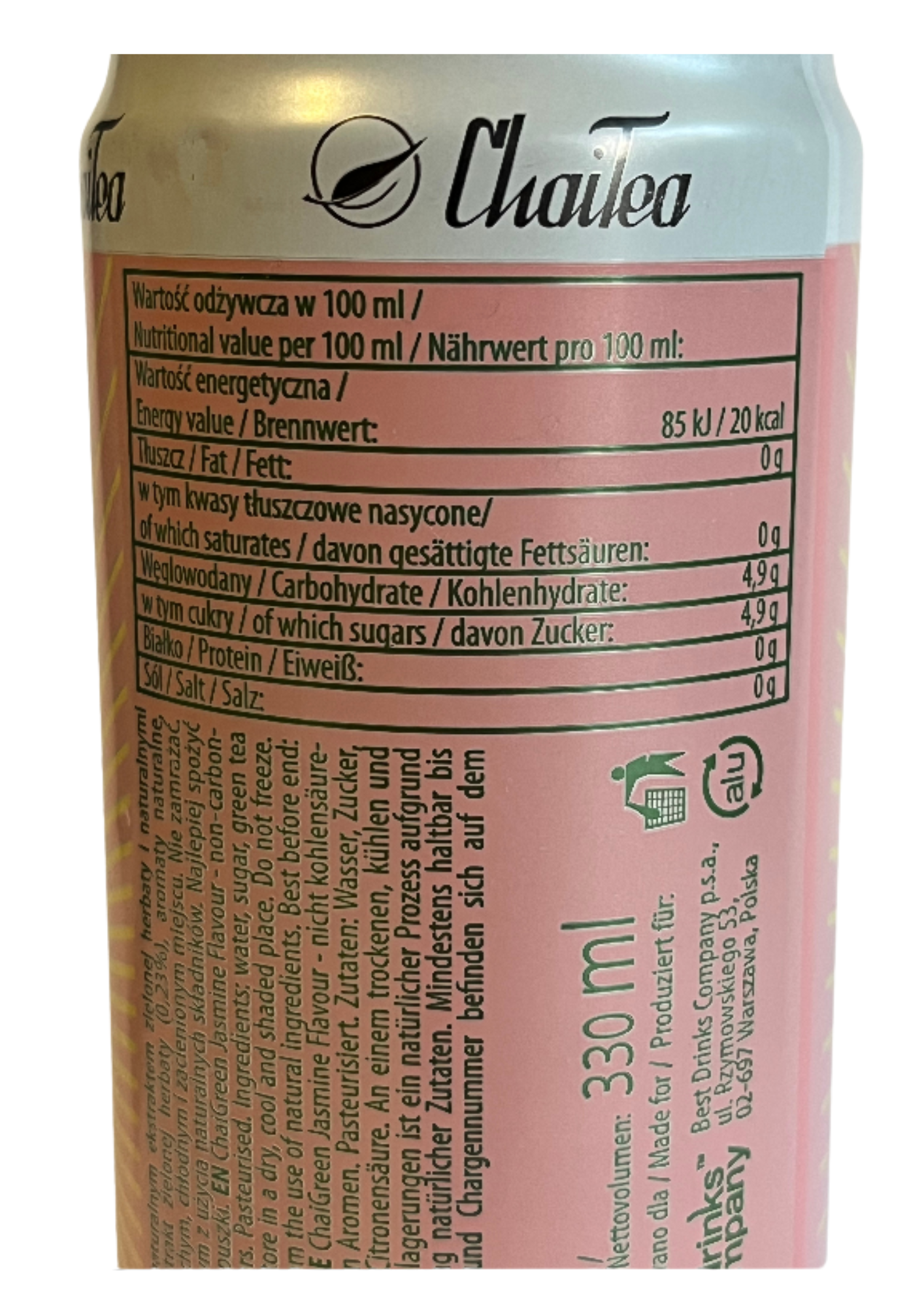 - Naturalne składniki – napój oparty na ekstrakcie zielonej herbaty (0,23%), bez sztucznych barwników i konserwantów.